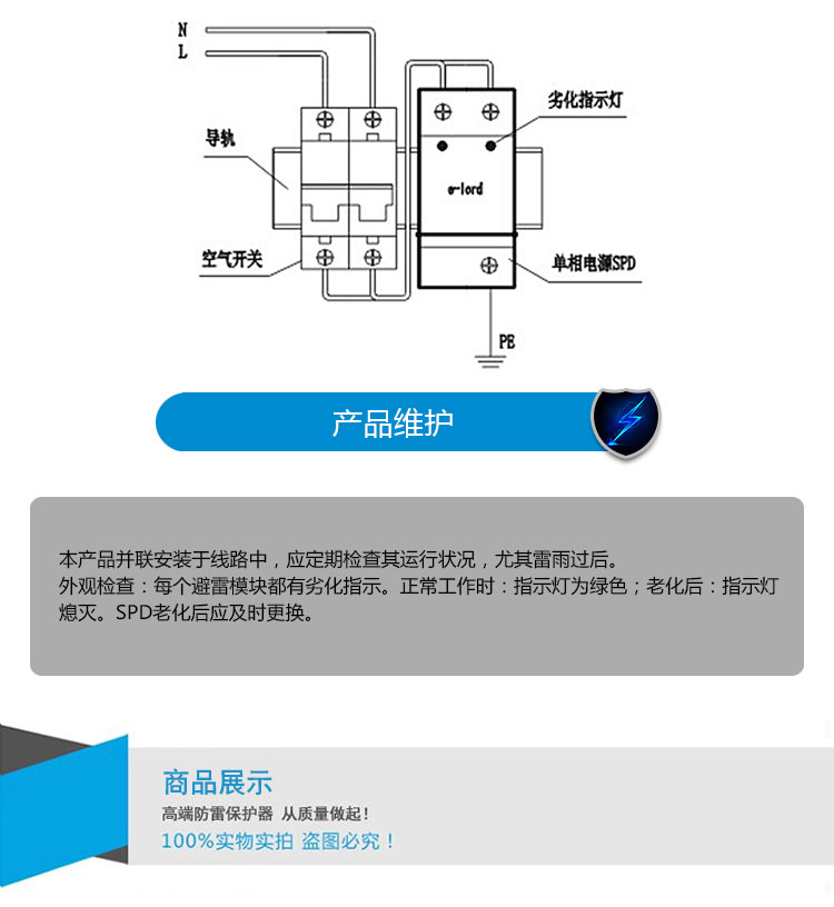 1. 已有可靠接地系統(tǒng),在配電柜(避雷器安裝處)的接地樁 (條)上進(jìn)行接地電阻的測定,電阻應(yīng)符合相關(guān)規(guī)范要求。 (或滿足國家、部級(jí)標(biāo)準(zhǔn))。 2. 配電柜中應(yīng)留有安裝避雷器的空間, 注:L為電源相線;N為電源零線;PE為地線。 | 應(yīng)檢查空氣開關(guān)已經(jīng)合閘導(dǎo)通,以保證避雷器處于運(yùn)行狀態(tài); 不要在雷雨天安裝。 |